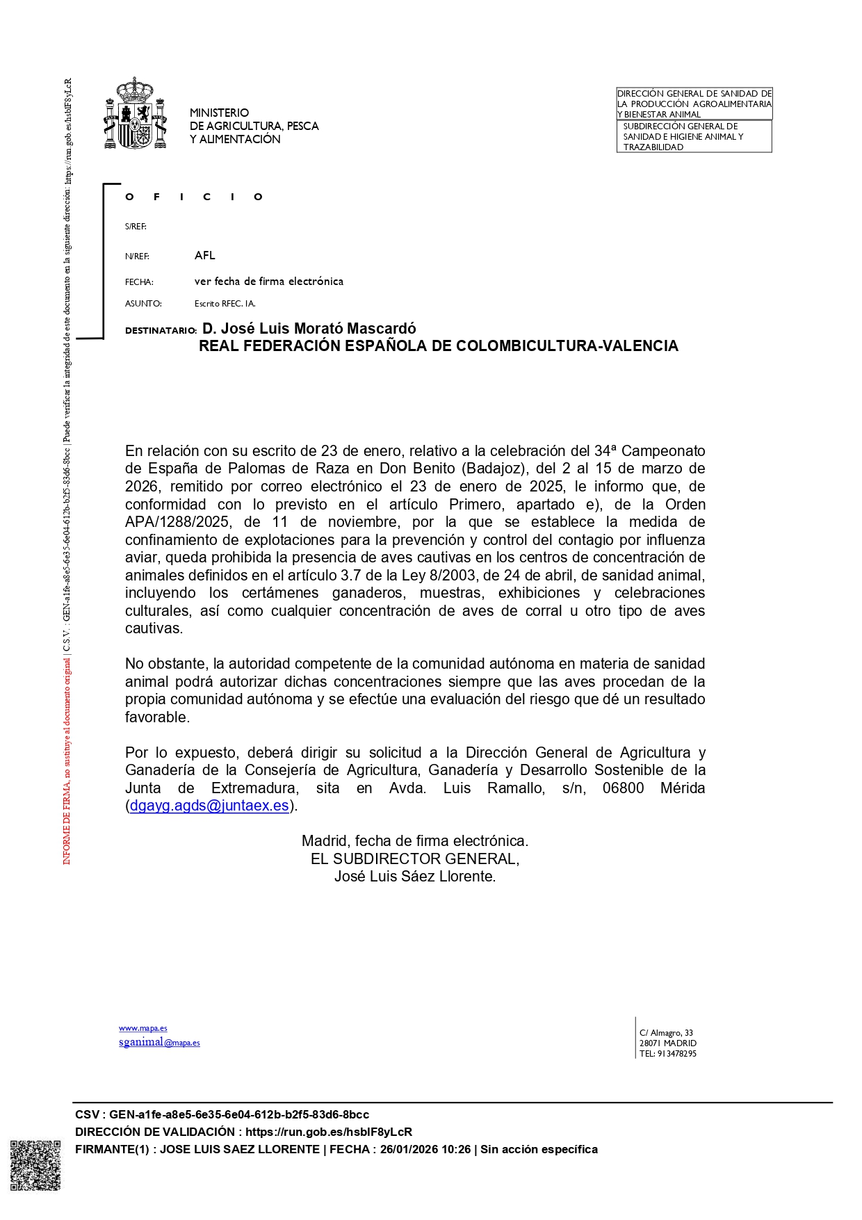 Respuesta del Ministerio de Agricultura, Pesca y Alimentación ante el requerimiento para la celebración del Campeonato de España de Palomos de Raza, 2026.